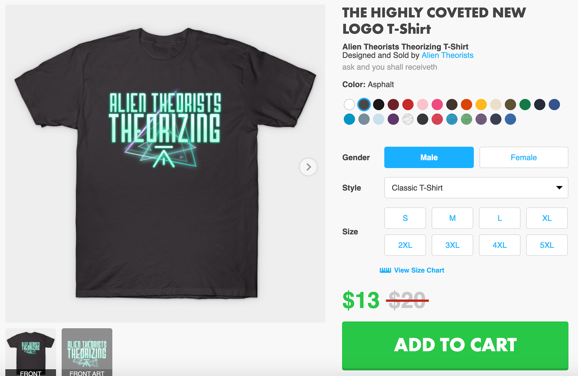 Designs for the comedy/conspiracy podcast, Alien Theorists Theorizing. Used on merchandise like t-shirts, sweatshirts, stickers, bags, phone cases, and more.